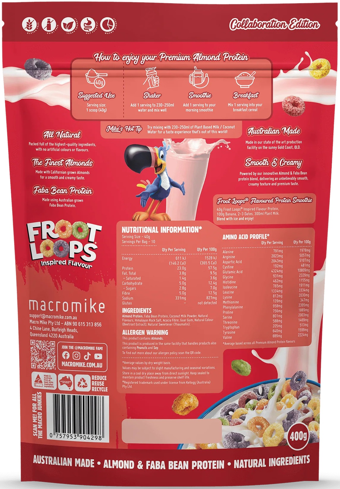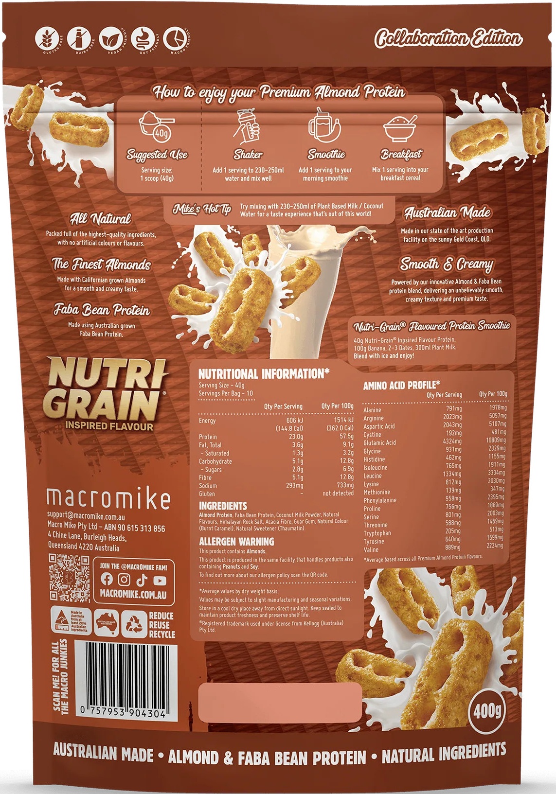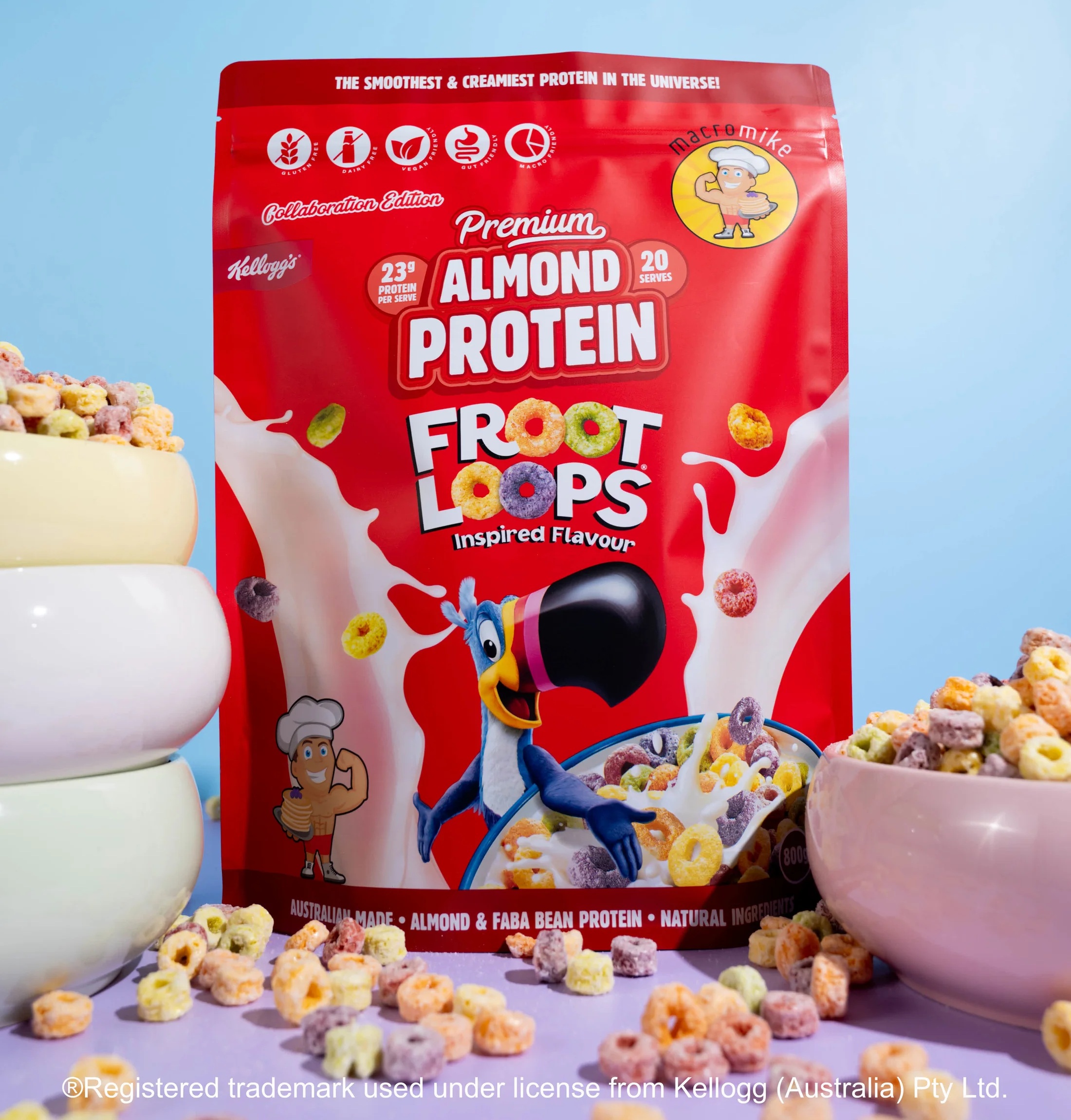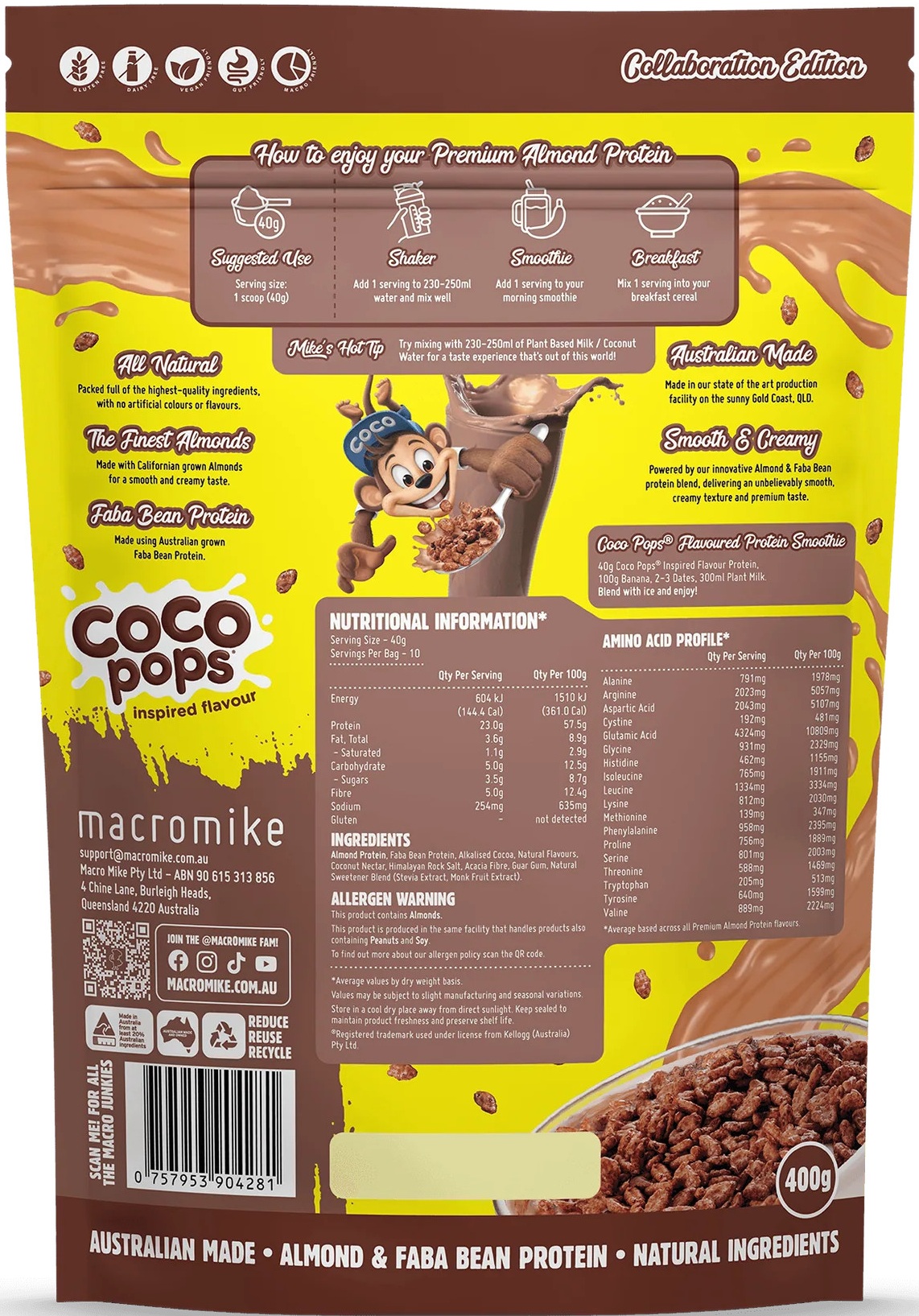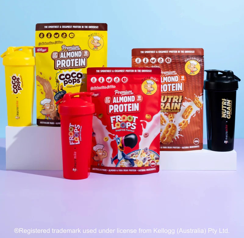 Macro Mike Kellogs Almond Protein is a creamy, plant-based Almond and Faba Bean protein blend designed to deliver smooth mixability, dessert-like flavour and over 23 g of gut-friendly protein per serve. It fuels your day with clean, all-natural ingredients that are gentle on digestion. Crafted for those who want high performance, this Almond Protein offers an incredibly nostalgic flavour and total dietary freedom!