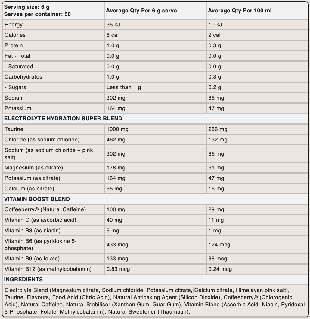 To keep you alert and switched on, Hydrate + Caffeine includes 100 mg of natural caffeine sourced from CoffeeBerry®, along with taurine and B-group vitamins (B3, B6, B9 and B12) to support energy metabolism and reduce feelings of fatigue.