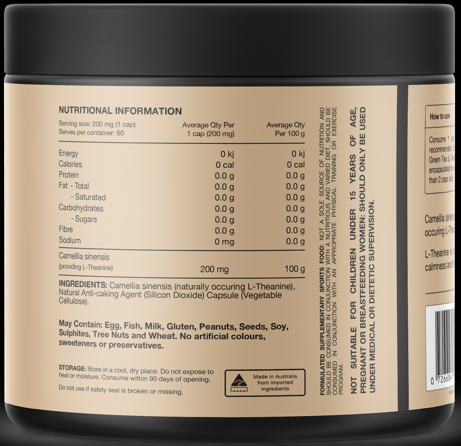 INGREDIENTS: Camellia sinensis (naturally occurring L-Theanine), Natural Anti-Caking Agent (Silicon Dioxide), Capsule (Vegetable Cellulose).