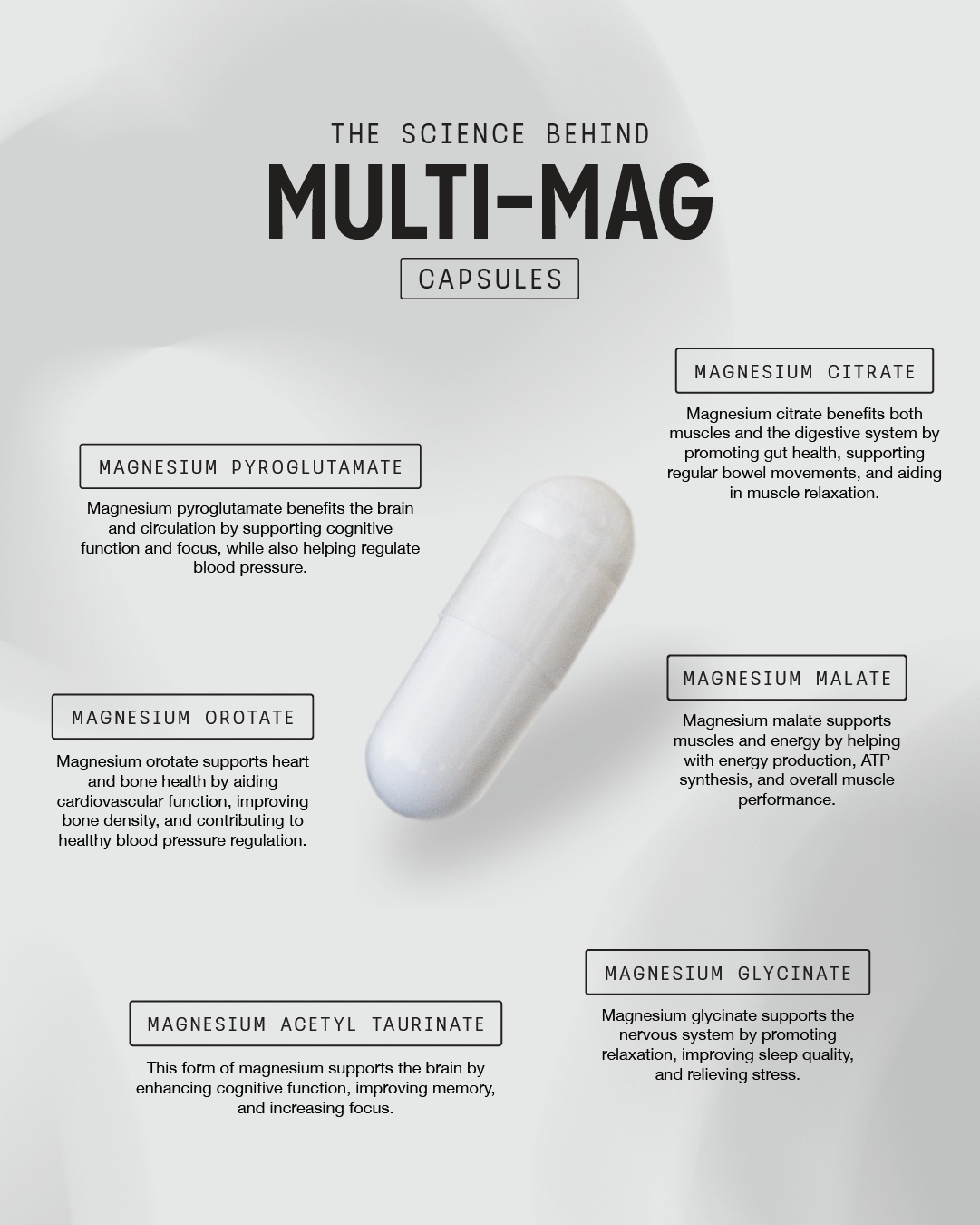 INGREDIENTS: Magnesium Citrate, Magnesium Glycinate, Magnesium Malate, Magnesium Pyroglutamate, Magnesium Acetyl Taurinate, Magnesium Orotate, Vitamin C (Ascorbic Acid), Zinc Citrate Dihydrate, Vitamin B6 (Pyridoxine 5-Phosphate), Capsule (Vegetable Cellulose).