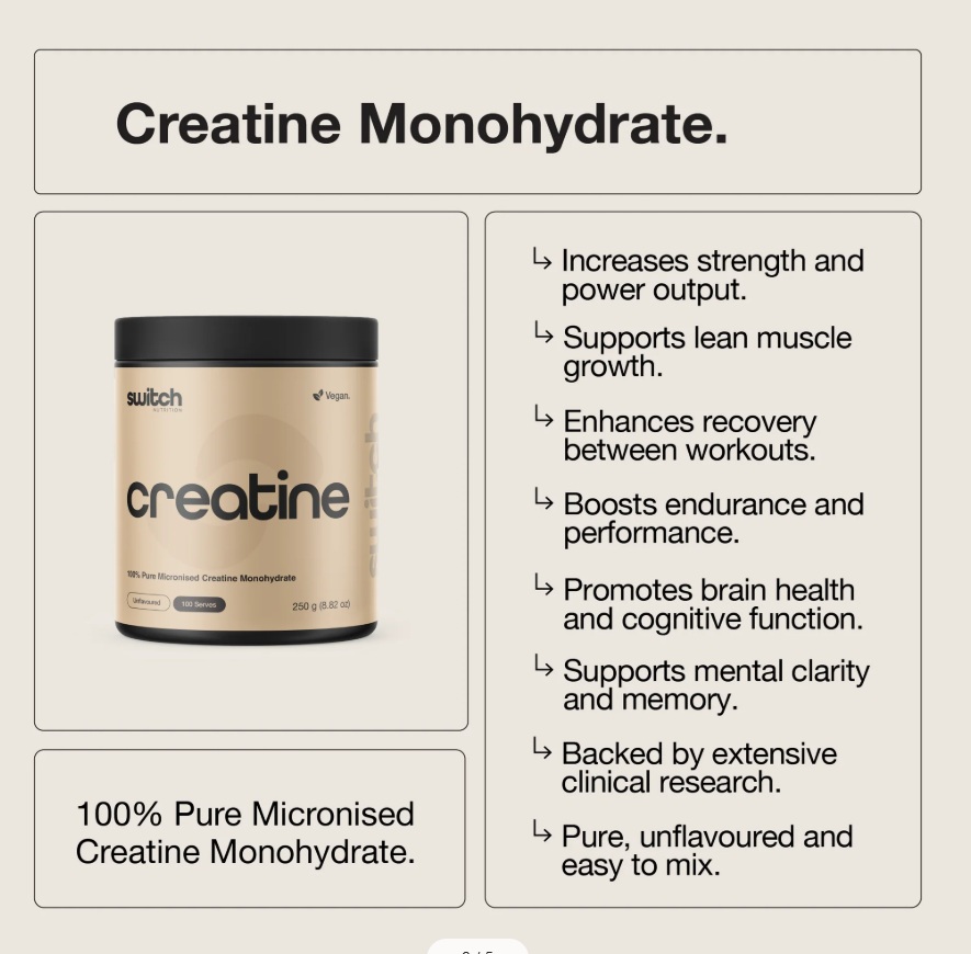 Switch Nutrition Purest Creatine is a premium-grade sports supplement formulated to enhance strength, explosive power, endurance and muscle recovery. This supplement supports phosphocreatine stores in the muscles, allowing for improved high-intensity performance and faster recovery between sets. Trusted in sports nutrition, Switch Creatine supports measurable gains in size and performance when combined with consistent training.