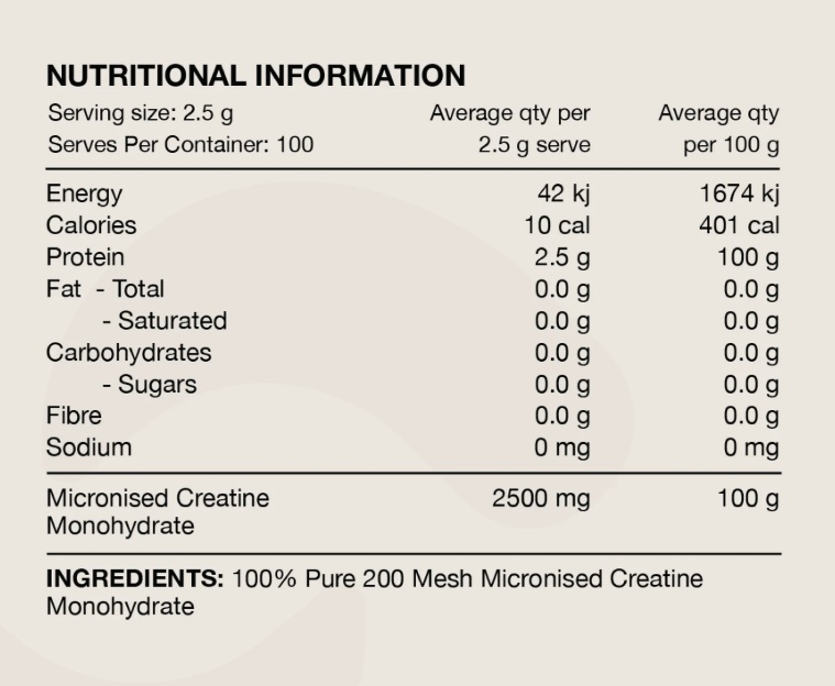 INGREDIENTS: 100% Pure 200 Mesh Micronised Creatine Monohydrate.